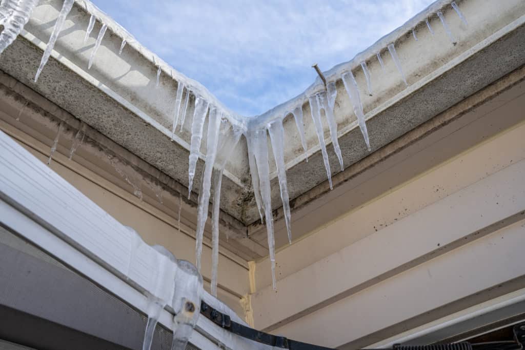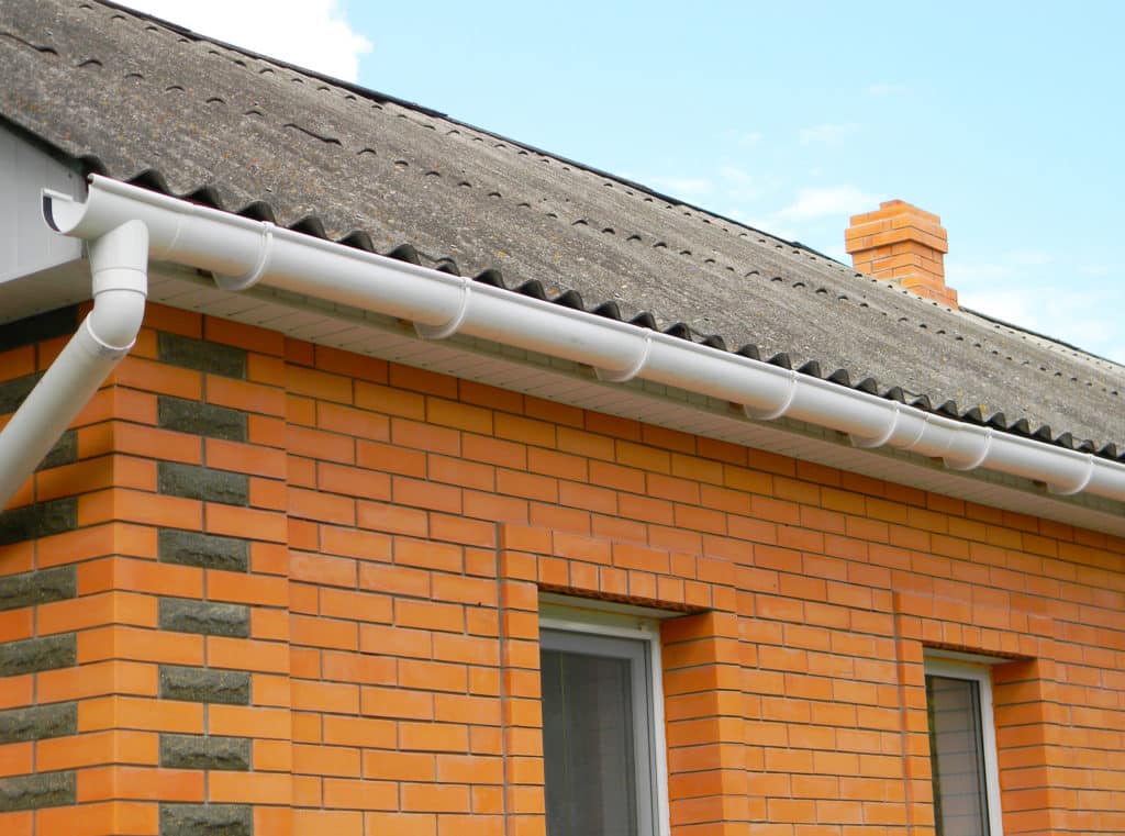 Close up on white plastic rain gutter. House roof guttering repair.